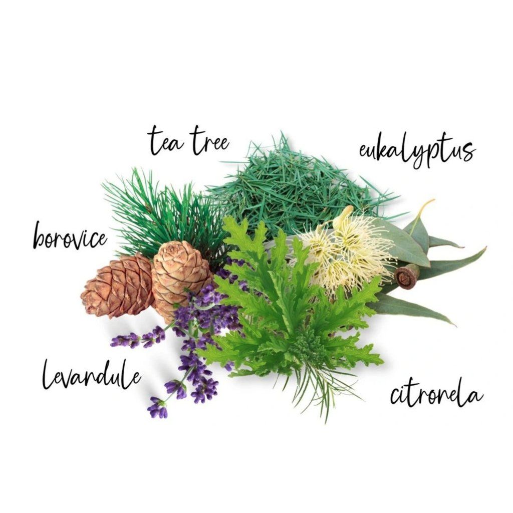 Ethanol denat., caprylyl/capryl glukosid, bio esenciálne oleje citronela, borovica, eukalyptus, levandula a tea tree (Cymbopogon winterianus, Turpentine, Eucalyptus globulus, Lavandula hybrida sp. Grosso, Melaleuca alternifolia), Alpha Terpinene*, Geraniol*, Linalyl Acetate*, Linalool*, Citronellol*, Pinene*, Terpineol*, Citral*, Limonene*, Camphor*, Terpinolene*.*z esenciálneho oleja